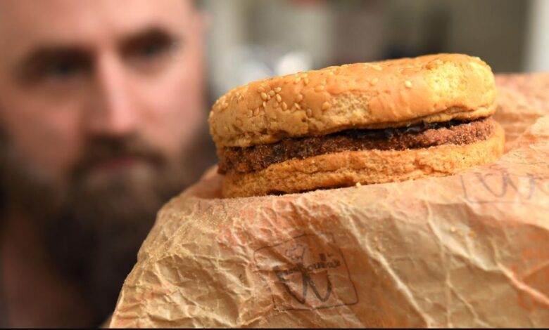 2019年11月7日,在墨爾本,凱西·迪恩(Casey Dean)正在查看一個購於1995年、並在澳大利亞的棚屋裡存放了多年但據稱從未發黴分解的麥當勞漢堡。儘管如此,漢堡的質地和外觀也還是發生了些許變化。尼茨表示,「唯一發生變化的就是它的尺寸縮小了。」漢堡已完全變硬,但令人驚奇的是,它沒有產生任何氣味或發黴。