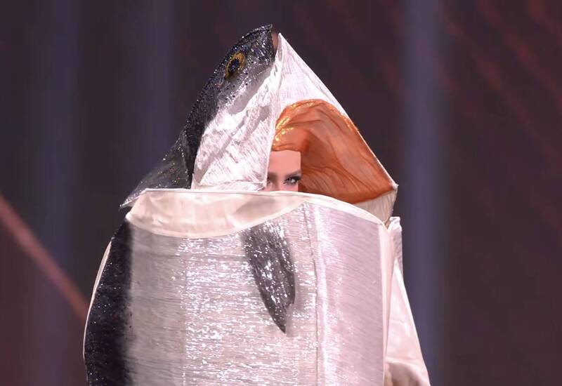 勒德蘭這身鮭魚裝以銀色和粉紅色為主色調,帶有魚鱗、魚鰭及模擬鮭魚頭部結構的服裝,是為了致敬挪威的海洋文化。挪威是全球最大的鮭魚出口國之一,這套服裝象徵著該國在經濟上的自豪與深厚的漁業傳統。