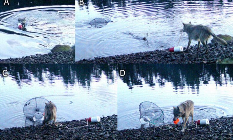 影片紀錄顯示,一隻雌性野生狼游入海中,咬住連接捕蟹籠的浮標並將其拖回岸邊。上岸後,她拉動連接浮標的繩索,將沈在深水底部的籠子拉上沙灘。最後,她咬破籠子的網眼,取食裡面的誘餌。