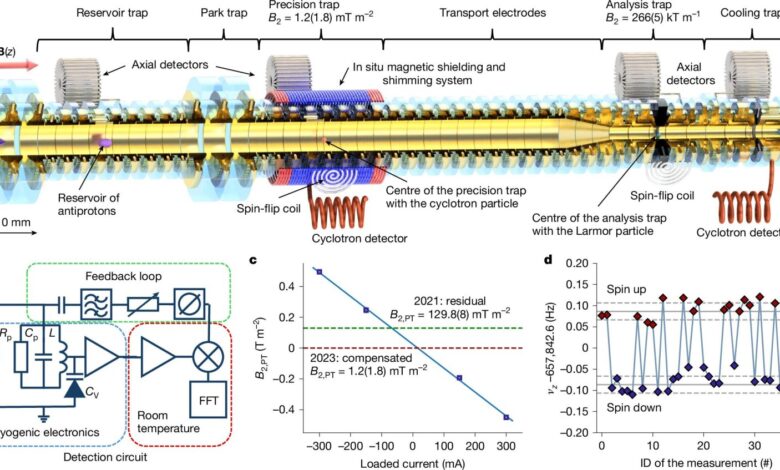 a. 主要實驗裝置:圖中顯示用於囚禁與操作反質子的多區段電磁阱(Penning trap)系統,包括反質子儲存區、精密量測區與分析區,並配有磁場補償、冷卻、旋轉與自旋翻轉等檢測與操作裝置。
