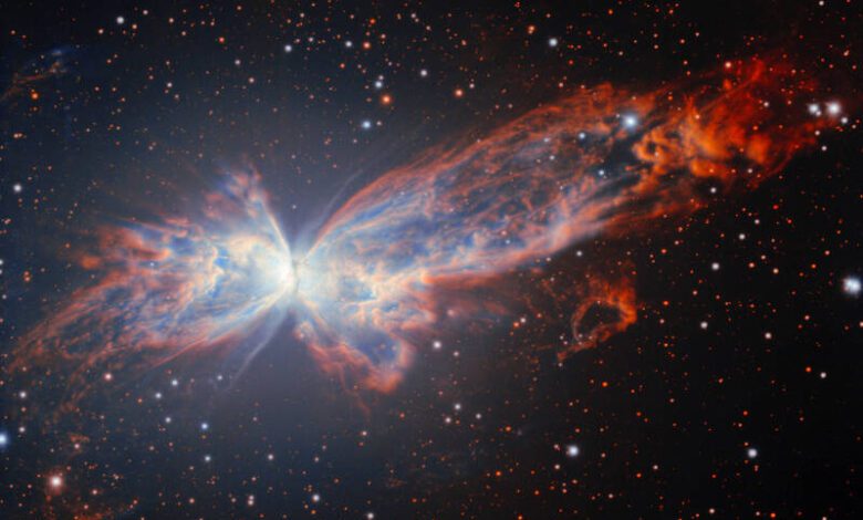 根據《美聯社》報導,智利的望遠鏡「雙子座天文台」(Gemini Observatory)於上個月拍攝該照片。這個被恰如其分命名為「蝴蝶星雲」(Butterfly Nebula)的天體位於天蠍座,距離地球大約2500至3800光年遠。