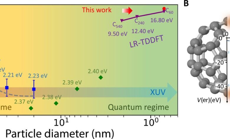 (A) 電漿共振的傅立葉限制壽命(FLL)隨粒子直徑變化。藍色和綠色點為文獻中不同尺寸奈米系統的實驗數據,灰色虛線為 Mie 理論預測,主要適用於經典區域。紫色點則為線性響應時間相依密度泛函理論(LR-TDDFT)對奈米或次奈米富勒烯的預測值,顯示在量子區域中。紅色圓點表示本研究統計平均後的時間延遲。圖中顯示,電漿共振的頻率可隨奈米粒子大小從近紅外(NIR)延伸至極紫外(XUV)範圍。
