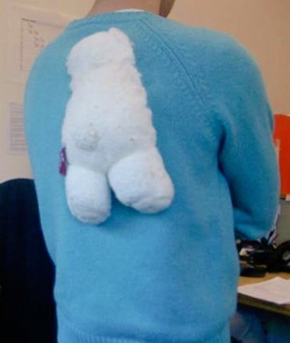 像是近期就有一位日本網友ダサセーター画像(@dasasweater),在推特上分享了一則白色小熊「貫穿身體」的立體毛衣,你可以看到在推主的前後分別露出小白熊的正面與背面,感覺上就好像是穿過推主的身體,對著鏡頭向各位說聲「Hi」一樣,是一件非常獨特且可愛的逗趣服飾。