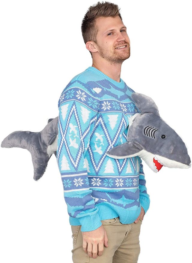 而其中也有人聯想到,在Amazon購物平台上也有類似於這件北極熊立體毛衣的相關服飾,只不過它不再是小白熊,它可以是條鯊魚、恐龍,或是馴鹿…等等,大致上你可以想像成是「買衣服送絨毛娃娃」的概念也行,畢竟這真的是穿來玩的XD
