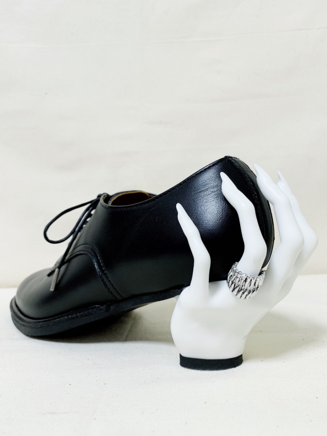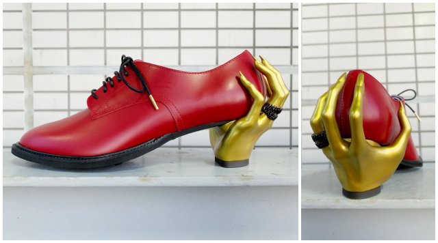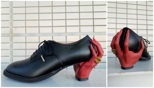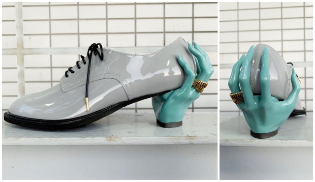 鞋身本身看起來並不特別,就是一般皮面鞋款的樣式,但是後面巨大的一隻手包覆著腳跟,在路上不知道會不會被人家誤以為腳上拖著一隻手在走路……。