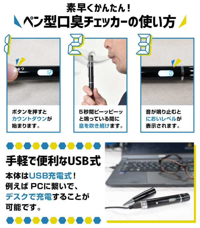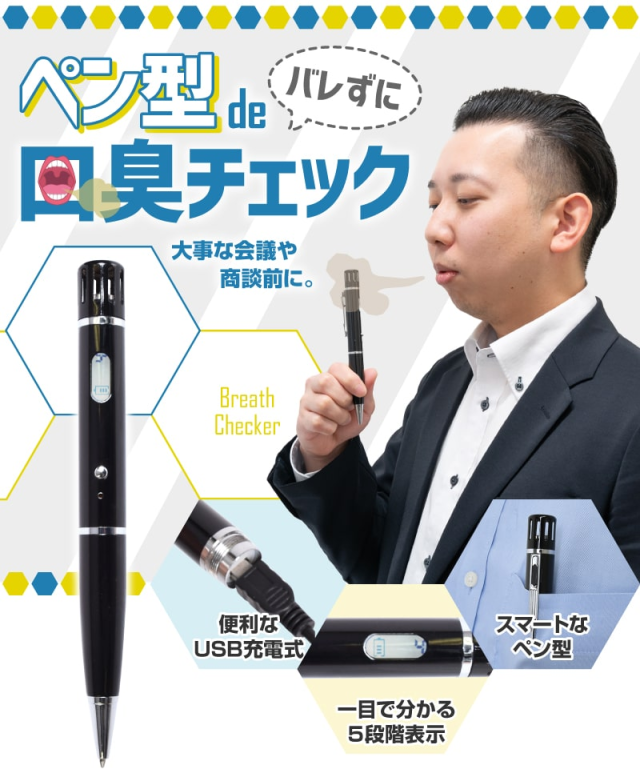 該商品有點類似酒精檢測器,一樣是對著檢測口吹氣並確認口臭的等級,只要對著原子筆上緣的檢測口吹氣就會顯示目前的等級,一共分為0~4五個等級,越高則表示口臭越重,而該檢測器是屬於USB充電式並可隨身攜帶充電,如果當前並無需要檢測口臭也可當作一般原子筆使用。