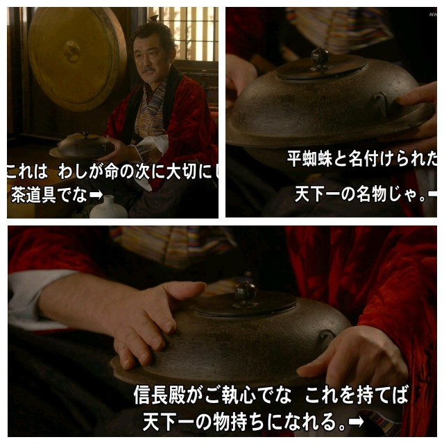 織田信長當時也對於茶具擁有濃厚的興趣,他自己就收藏有很多知名的茶具,對於松永久秀手上的『平蜘蛛』,他早就想納為己物的了。於日本播放的大河劇《麒麟來了》(麒麟がくる)也在第 40 話講述到關於茶器『平蜘蛛』的故事,足以見得在戰國時代茶器對於各路軍閥心中的地位。