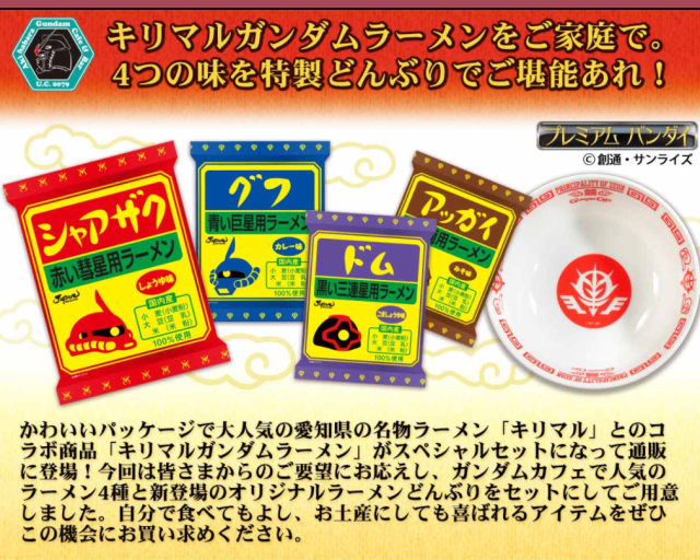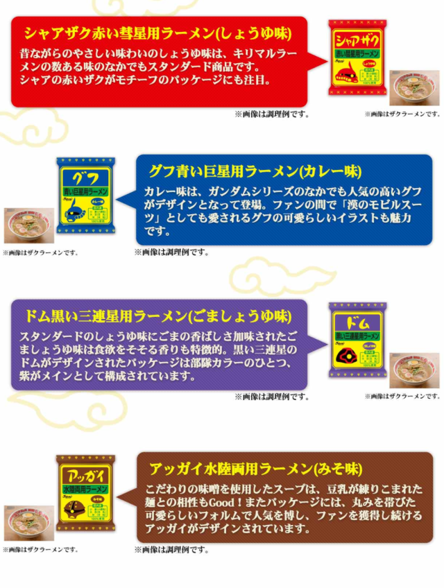 包含;夏亞薩克 ( 醬油 )、古夫 ( 咖哩 )、德姆 ( ごま醤油 ) 與亞凱 ( 味噌 ) 四種口味,連外包裝都特別以拉麵品牌 キリマル 結合 MS 的形象設計。