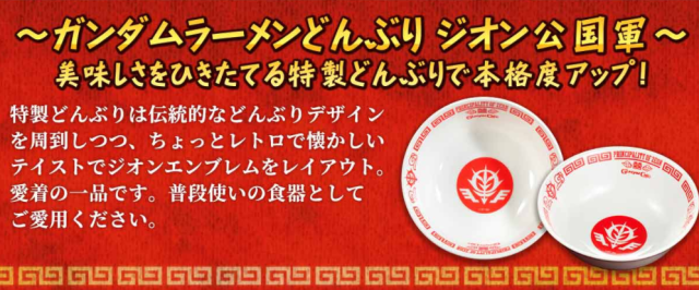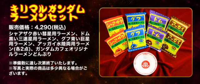 這次推出的拉麵分別以吉翁軍的 MS 系列-包含;夏亞薩克 ( 醬油 )、古夫 ( 咖哩 )、德姆 ( ごま醤油 ) 與亞凱 ( 味噌 ) 為賣點,分別代表不同的口味。拉麵製作由日本從 1965 年創立的愛知縣在地拉麵品牌 キリマル 製作,長年製作美味料理的經驗,品質上無須擔憂。