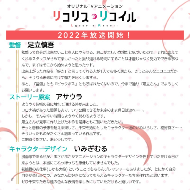 擔任過《刀劍神域》系列、《WORKING!!迷糊餐廳》系列等多數人氣作品的角色設計與總作畫監督的足立慎吾,這次首次將擔綱原創動畫《Lycoris Recoil》的導演,這部由 A-1 Pictures 製作的原創動畫,近日也釋出宣傳影片與前導視覺圖,預計將於 2022 年間播出。