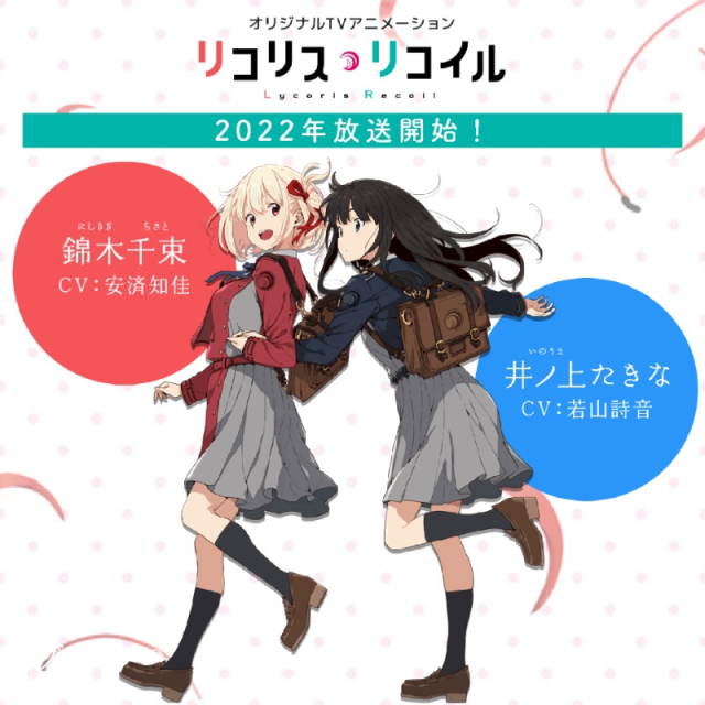 主要角色的聲優也已公開,錦木千束由配音過《人渣的本願》安樂岡花火與《SSSS.DYNAZENON》飛鳥川知世的聲優安濟知佳擔綱;而另一主角井ノ上たきな則由配音《SSSS.DYNAZENON》南夢芽與《無職轉生~到了異世界就拿出真本事~》七星靜香的若山詩音負責。