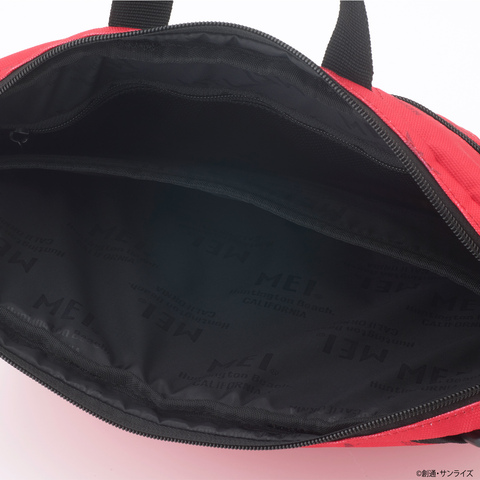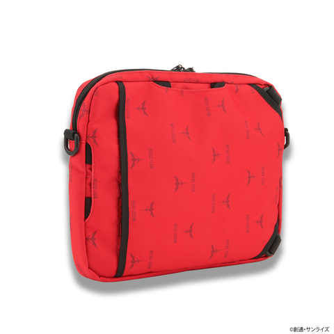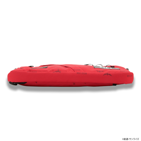 包包整體以紅色為基底,加入了新吉翁的文字以及圖騰,以滿版的方式呈現。包包可透過變化改為手提、側背與後背,容量上也可以負載 13 吋筆電及 A4 大小的書本。