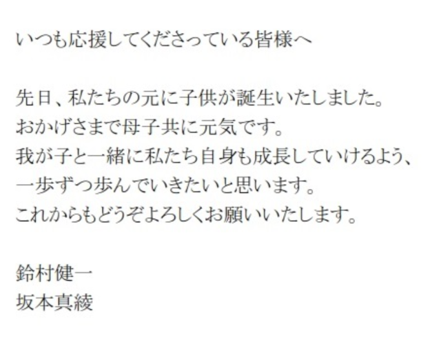 結婚至今 11 年,兩人才終於獲得一子,由於坂本真綾已 42 歲為高齡產婦,如今順利生產也讓不少粉絲與配音圈友人紛紛道賀。兩人也由事務所 INTENTION 宣布產子消息,對於支持兩人的粉絲感到十分開心,未來會陪伴孩子成長茁壯,也會逐漸精進自己為人父母的責任。