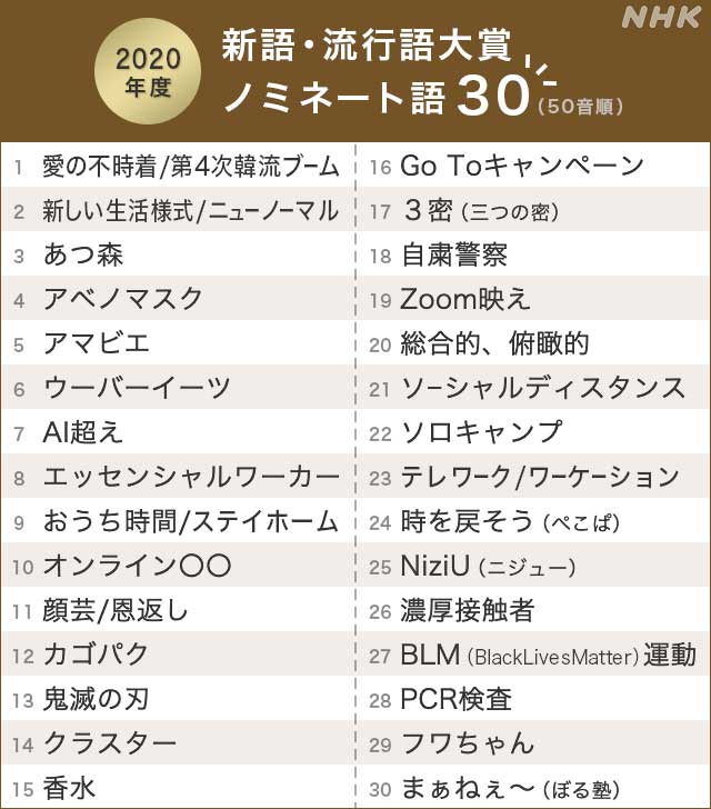 更多的排名小編就放在最後了,也可以發現許多流行語都是因為武漢肺炎的疫情而起,不論是生活上的改變或是政策的實施,都足以了解整個 2020 年日本面對疫情的艱困與成效,或許我們也只能希望在這些流行語背後,能夠讓日本政府更積極的面對疫情,以免現在冬季疫情的再次爆發 QQ。